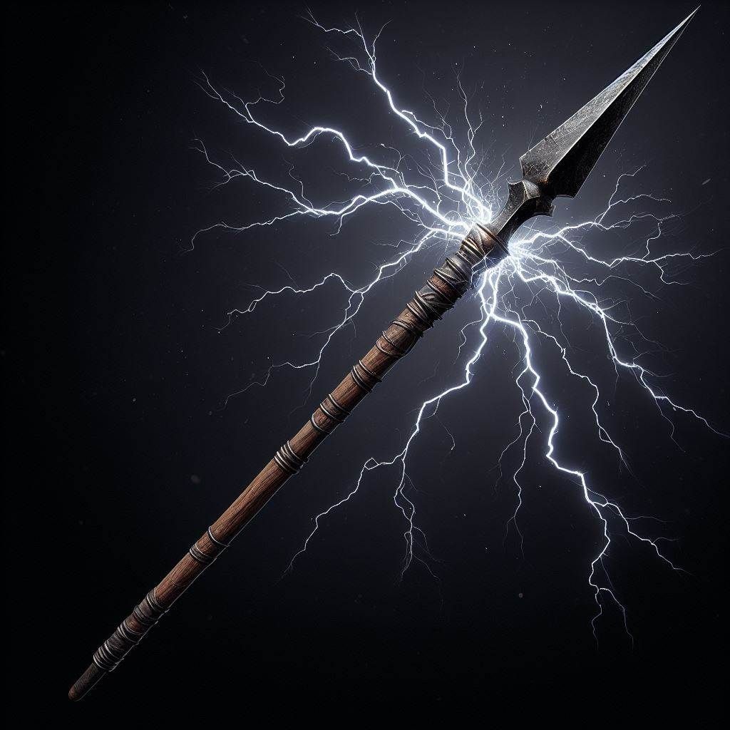 This spear is crafted from dark, almost black iron that shimmers faintly with an inner blue glow. Jagged, corrupted lightning occasionally runs in err...