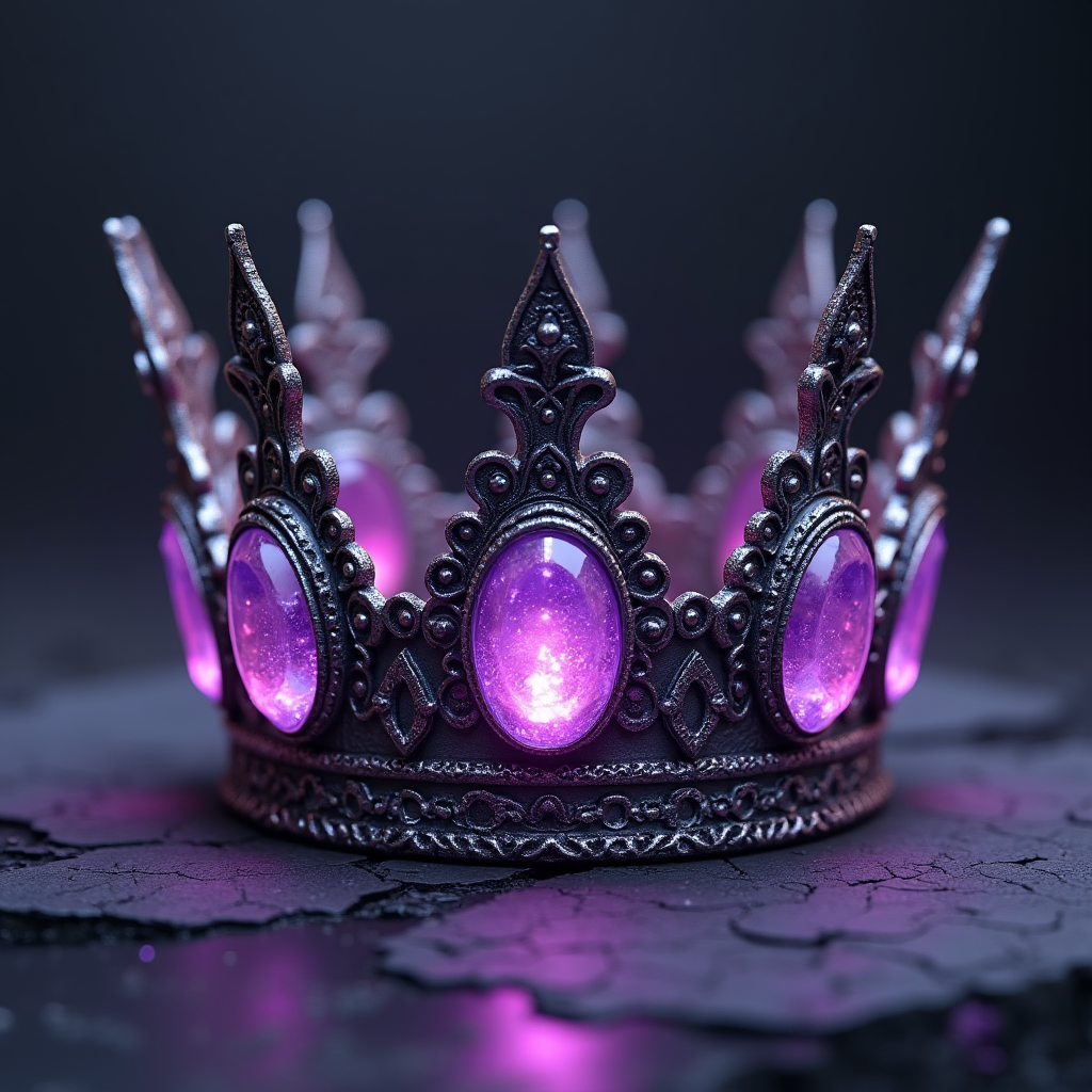 A blackened silver crown adorned with floating violet gemstones that drift slightly above the metal. The crown crackles with eerie purple energy, and ...