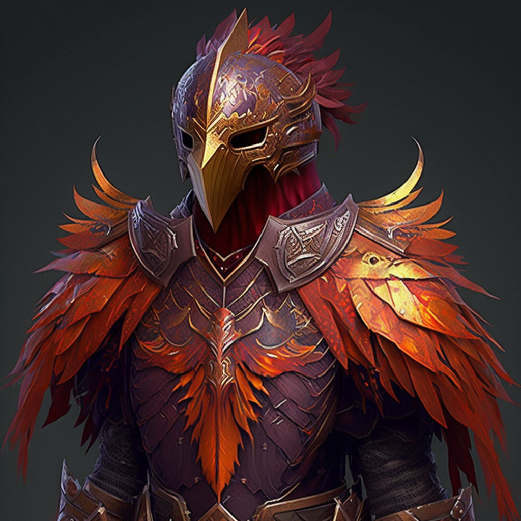 This armor is made from the feathers and scales of a phoenix. The armor is mostly red and gold, with hints of orange, yellow, and purple. The feathers...
