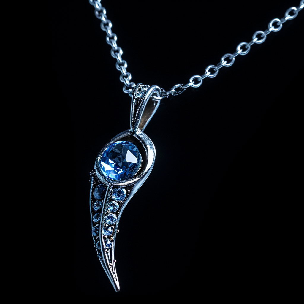 This silver necklace has a pendant shaped like a comet, with a blue gemstone as its head and a trail of smaller stones as its tail. The pendant glows ...