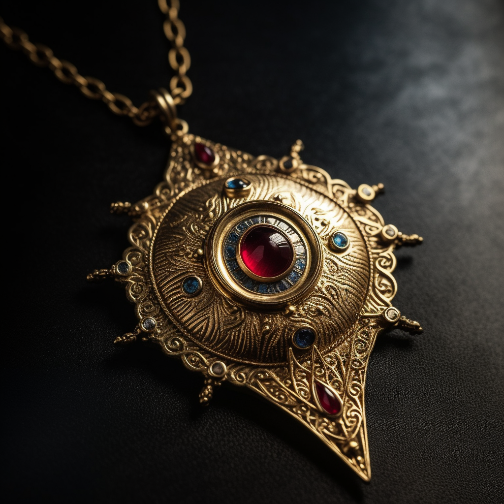 This amulet is shaped like a golden eye with a ruby pupil that glows with a fiery light. The eye is surrounded by intricate rays of gold that form a s...