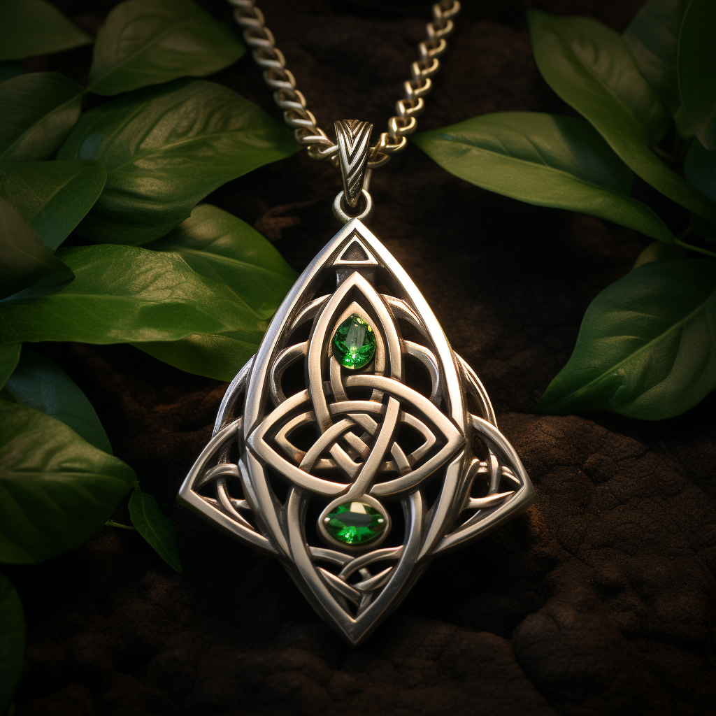 This finely crafted amulet of intertwined silver is adorned with two emeralds.