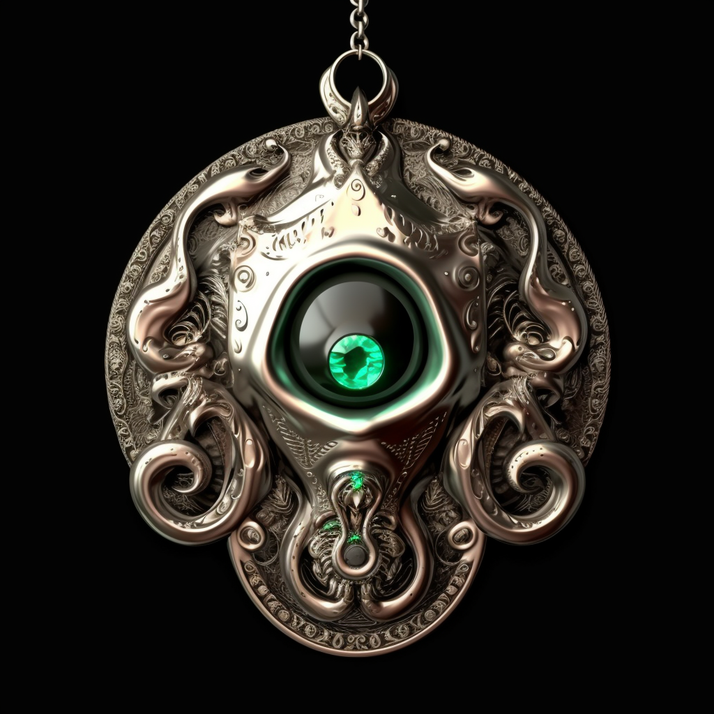 This amulet is made of a black metal that feels slimy to the touch. It has a single red eye embedded in its center, which occasionally blinks and move...