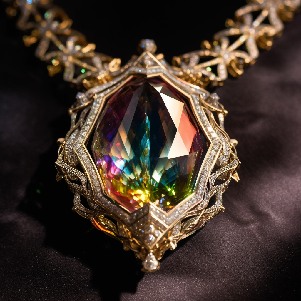 This amulet has a large rainbow facet gem set in the center of a gold and platinum filigree. The gem sparkles with different colors as it catches the ...